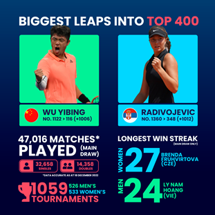 Meanwhile, Wu Yibing made the biggest jump into the men’s Top 400, putting an injury-hit spell behind him to climb 1,006 places in the ATP rankings. A season that began with his first title in five years at M15 Orange Park ended with the Chinese player having accumulated three ATP Challenger Tour titles and sitting just 16 spots off the Top 100.