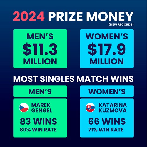 Gengel also led the tour for most men’s singles match-wins, compiling an 83-21 win-loss record this season, while Slovakia’s Katarina Kuzmova won the most women’s singles matches, ending the year with a 66-27 record.