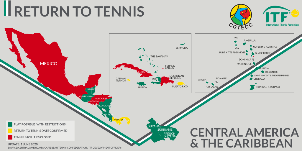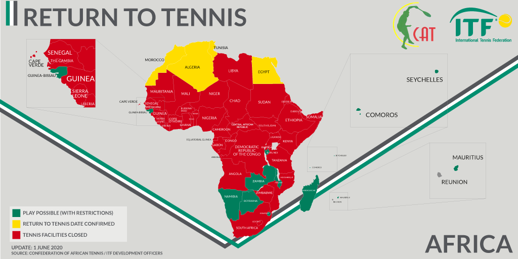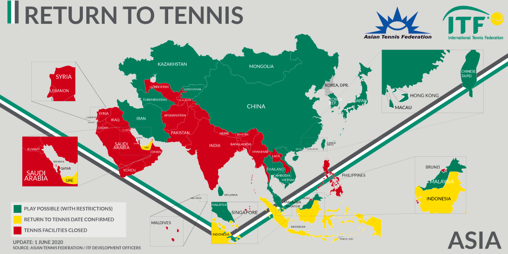 The following information has been compiled by the ITF with help from our Regional Associations and ITF Development Officers. As of 1 June 2020, 121 of 210 ITF member nations have guidelines in place that permit the use of tennis facilities.