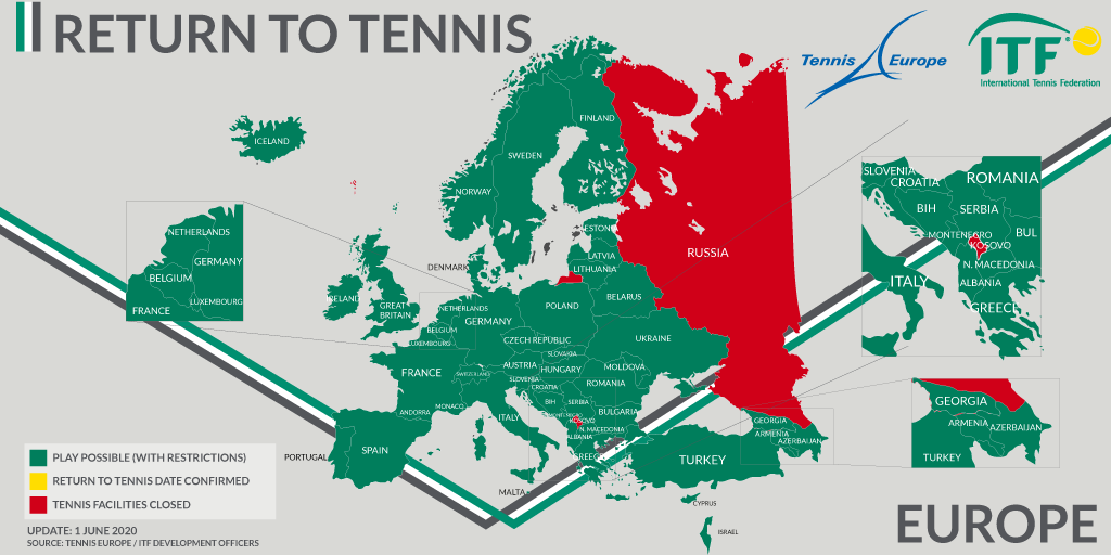 The following maps and list are for illustrative purposes only – all tennis players should follow the instructions of their local authority. To get in touch with your National Association, you can find their contact details here.