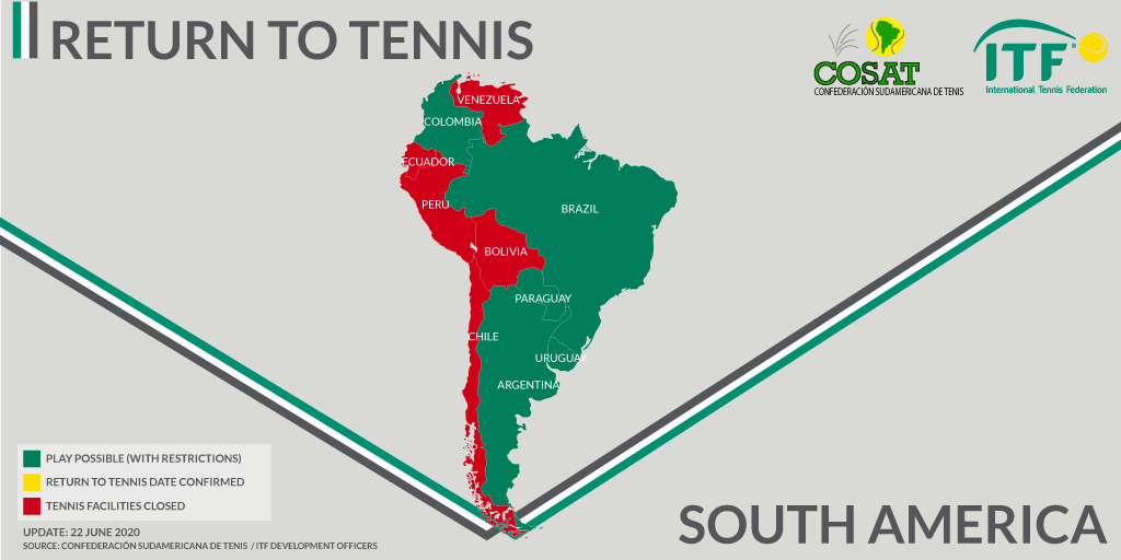 The following information has been compiled by the ITF with help from our Regional Associations and ITF Development Officers. As of 22 June 2020, 145 of 210 ITF member nations have guidelines in place that permit the use of tennis facilities.