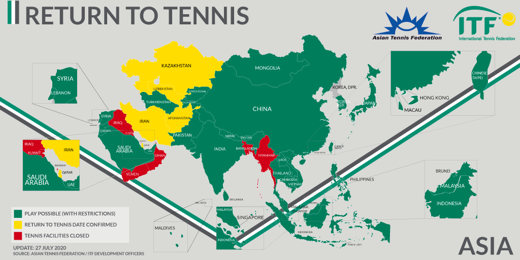 The following information has been compiled by the ITF with help from our Regional Associations and ITF Development Officers. As of 27 July 2020, 159 of 210 ITF member nations have guidelines in place that permit the use of tennis facilities.
